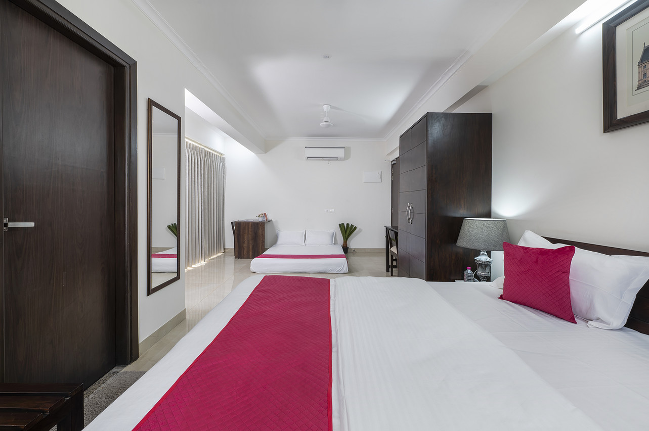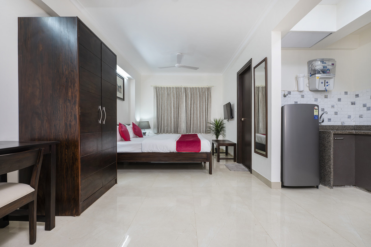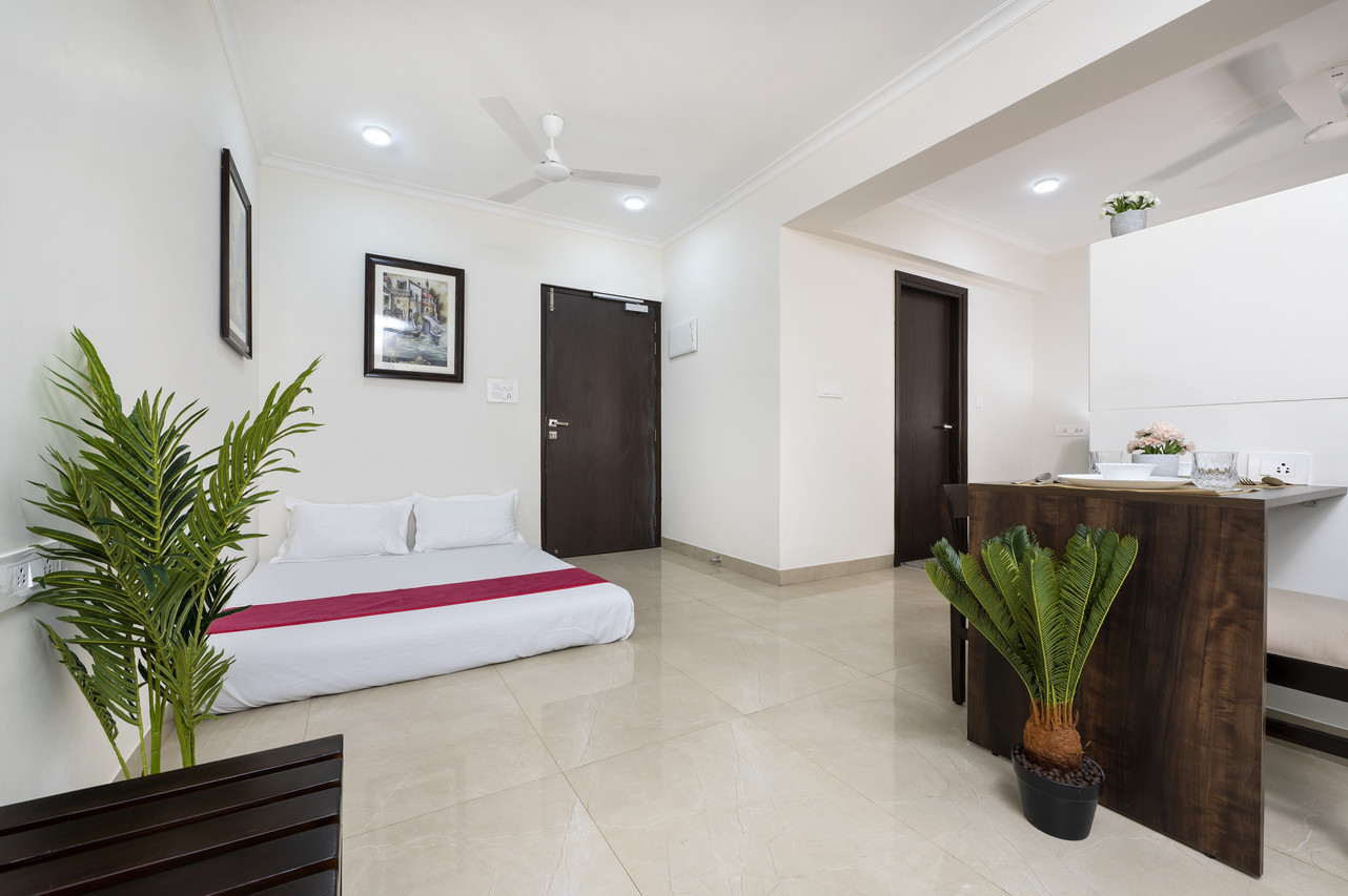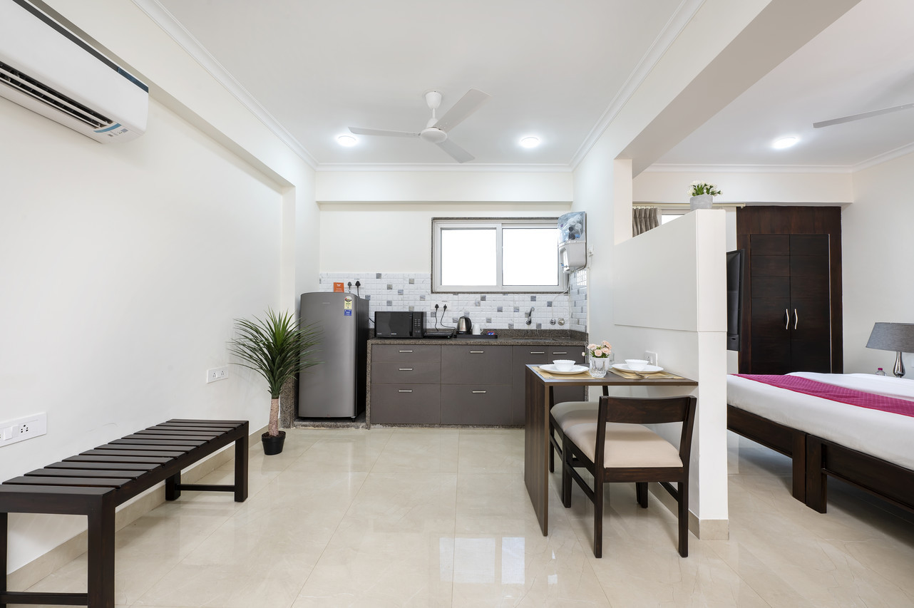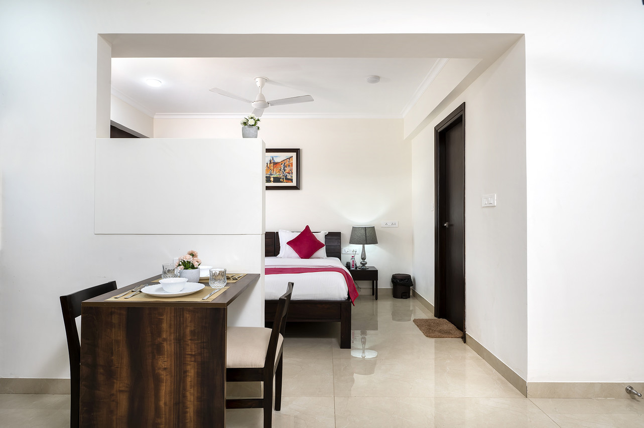 The Studio suite has all the comforts, amenities and appliances for a plush experience. An attached kitchen with refrigerator, microwave oven, induction cooktop and RO filter makes you completely self sufficient during your stay. Beside the spacious air-conditioned area you can breath fresh air and sun from your private balcony.
